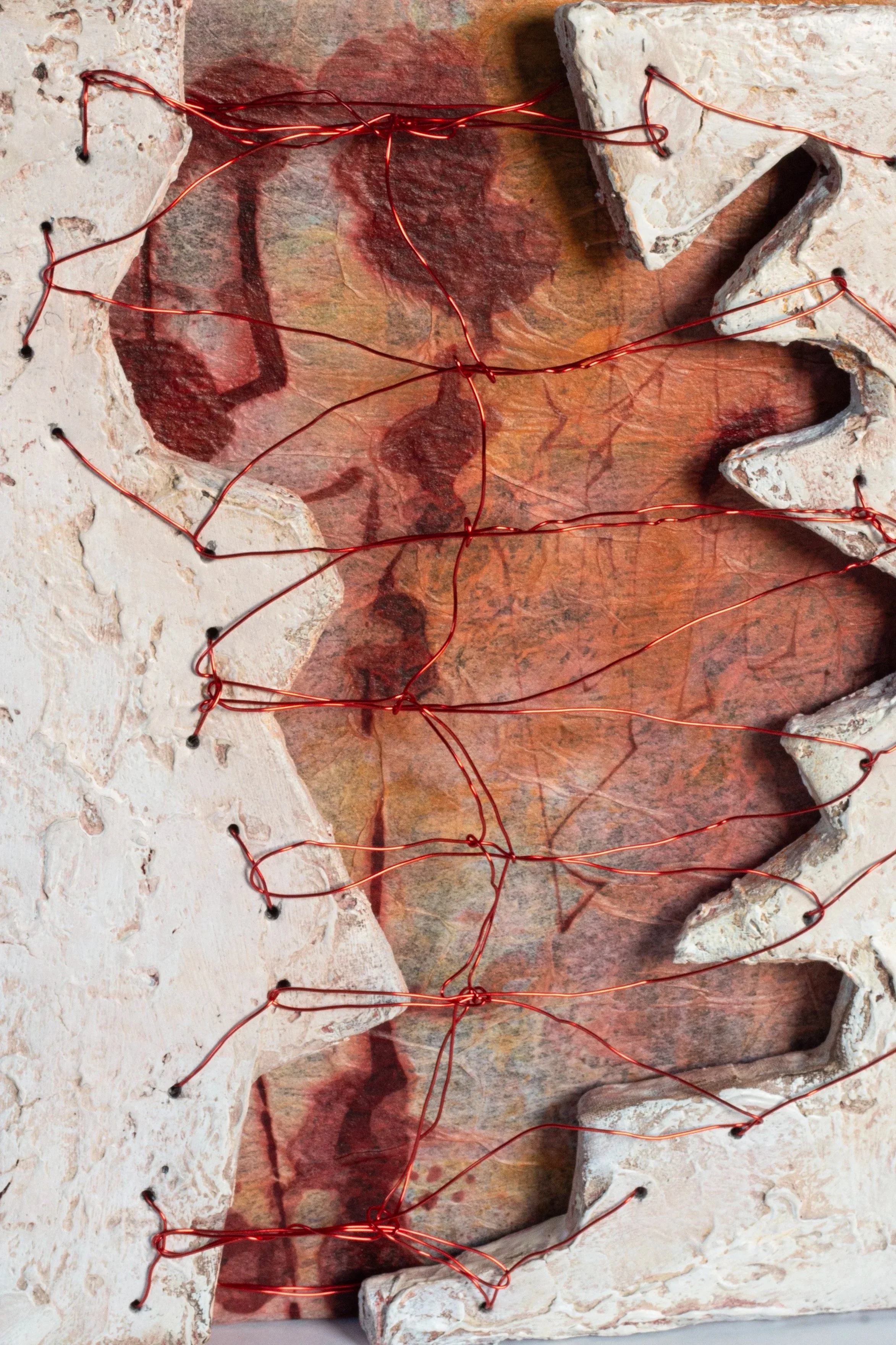 Through plaster, fibers, plant elements, and the pictorial bas-reliefs she creates, she stages bodies that become landscapes and displacements that take root. Across France and Romania, she transforms the fragility of memory into nearly bone-like structures, carrying the imprint of distance and transfiguring wounds into a form of visual repair.